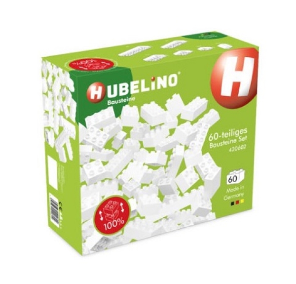 Voor gedurfde knikkerbaanconstructies heb je een stabiele fundering nodig. De 60-delige bouwstenenset breidt het assortiment knikkerbanen en bouwblokken uit voor kleine bouwmeesters die naar de hemel willen reiken. De witte bouwblokken vormen het ideale contrast met de kleurrijke renelementen en knikkers van de Hubelino knikkerbaan en helpen om de bouwblokken snel en duidelijk te onderscheiden van de renelementen. Zo zorgt het doordachte kleurconcept ook voor een betere oriëntatie en structuur voor de jonge knutselaars en denkers – zowel bij het bouwen als bij het opruimen.