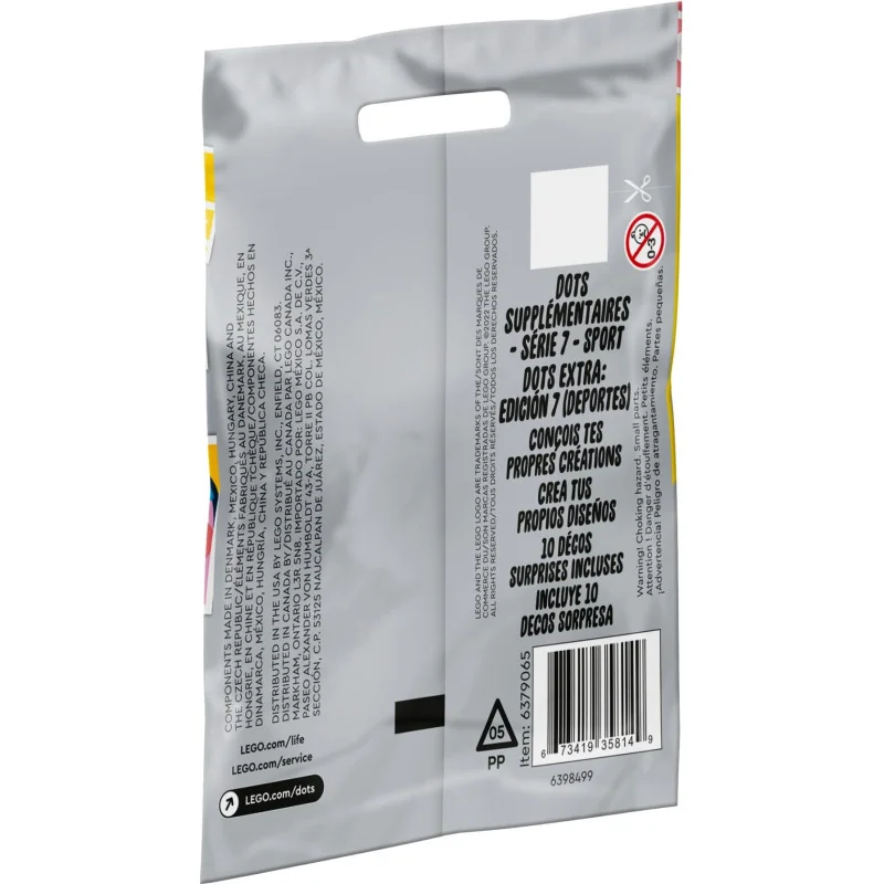 • Veiligheid voor alles – LEGO onderdelen worden gegooid, verhit, geplet, gedraaid en geanalyseerd om er zeker van te zijn dat dit extra DOTS serie 7 – SPORT zakje voldoet aan strenge wereldwijde veiligheidsnormen