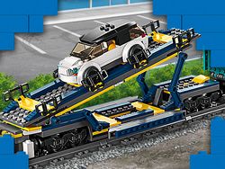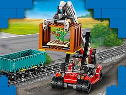 • Wat zit er in de doos? – een locomotief, platte wagon, open wagon, autowagon, 2 elektrische auto’s, een laadstation, 2 vrachtcontainers, een reachstacker, perron, 33 railelementen en 6 minifiguren
