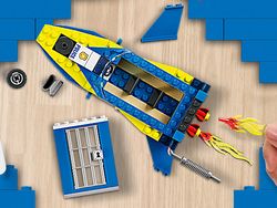 - Wat zit er in de doos? – alles wat kinderen nodig hebben om een missiespeedboot te bouwen en bouwuitdagingen op te lossen zonder instructies, plus 4 minifiguren, waaronder het personage Duke DeTain uit de tv-serie LEGO City Adventures