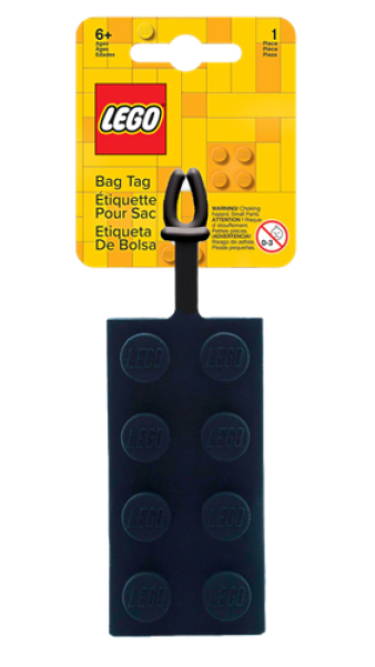 Omvat een siliconen bagagelabel in de vorm van een LEGO steen, met een riempje en ruimte achterop om je contactgegevens op te schrijven.