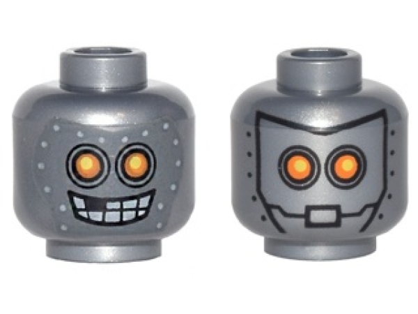 LEGO dubbelzijdig zilverkleurig minifiguur hoofd van een buitenaardse robot met aan de ene kant gele ogen, metalen masker met bouten en open mond. Aan de andere kant gele ogen, metalen masker en gesloten mond.
