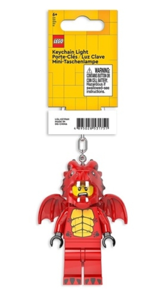 Een LEGO Sleutelhanger van een grote Man in Drakenpak minifiguur met beweegbare armen, een helder LED lampje in beide voeten, beweegbare benen om het licht naar verschillende kanten te laten schijnen en een knop op het lichaam om de lampjes aan te zetten. Heel leuk voor aan een (school-)tas, jas of sleutelbos.