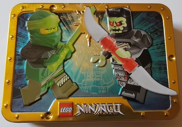 LEGO Ninjago speciale metalen doosje met Lloyd en Bottenkoning minifiguren.