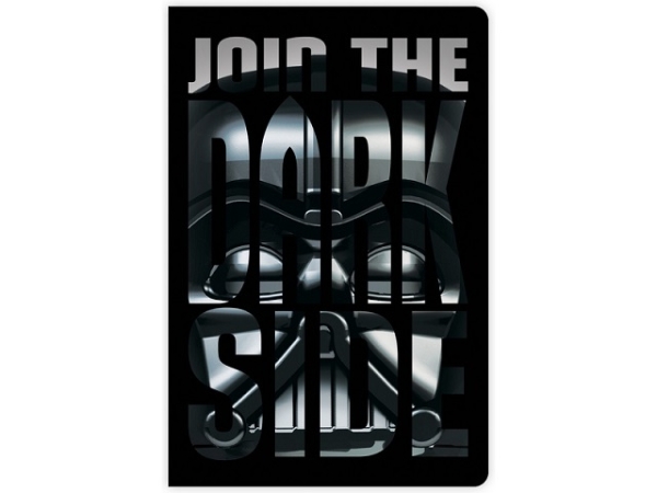 LEGO Notitieboek van star Wars met op de voorkant de tekst ‘Join The Dark Side’ met in de letters Darth Vader en achterkant een afbeelding van Darth Vader.