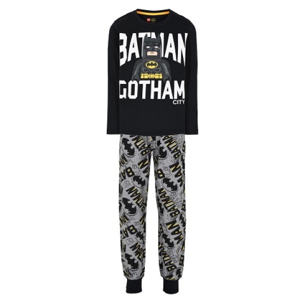 Coole LEGO Batman pyjama. Op de voorzijde staat een opdruk van Batman met de tekst: ‘Batman, Gotham City’. De broek heeft een patroon van het Batman logo en LEGO stenen. De achterzijde is effen.