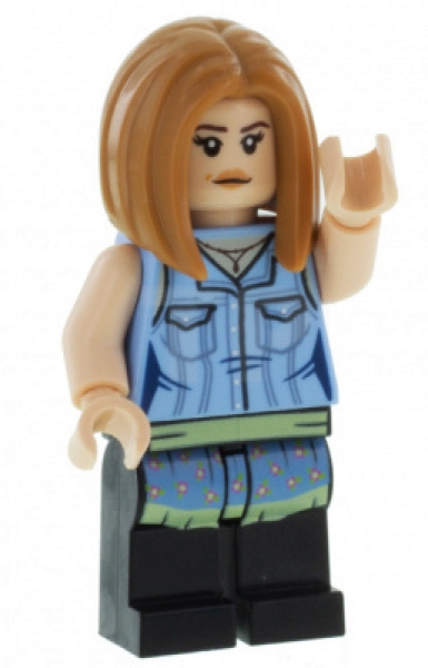 LEGO Rachel Green minifiguur (IDEA059) uit de bekende serie Friends. Met licht blauwe blouse met grijze strepen, twee gezichtsuitdrukkingen, een neutrale en een boze blik.