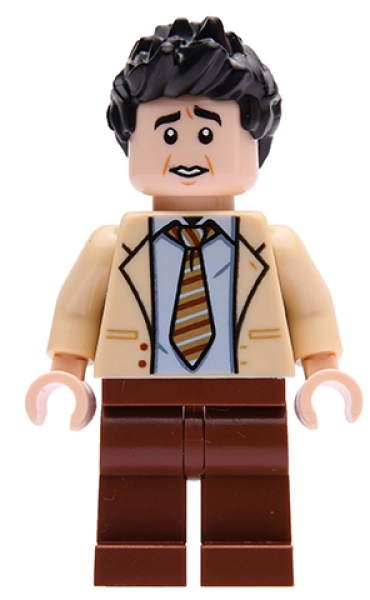 LEGO Ross Geller minifiguur (IDEA056) uit de bekende serie Friends. Met licht grijs shirt, beige blouse met een stropdas, twee gezichtsuitdrukkingen, een glimlach en een bezorgde blik.