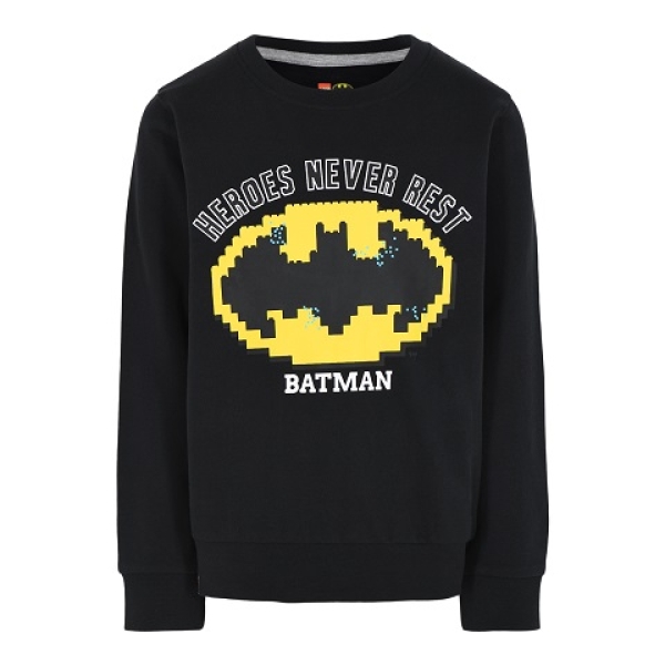 Mooi zwart LEGO sweatshirt met lange mouwen, op de voorzijde een opdruk van het LEGO Batman logo en de tekst: ‘Heroes never rest’. De achterzijde is effen.