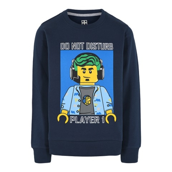 Cool donkerblauw LEGO City sweatshirt met op de voorzijde een opdruk van een LEGO gamer minifiguur en de tekst: ‘Do not disturb, player 1’. De achterzijde is effen.
