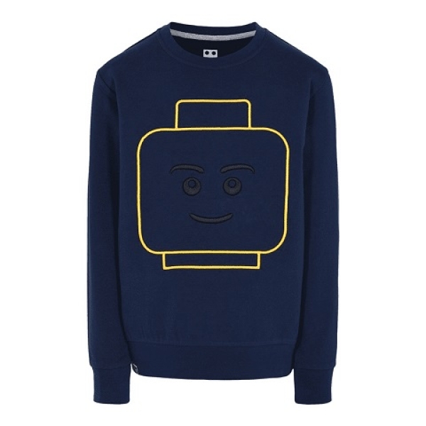 Mooi donkerblauw LEGO sweatshirt met lange mouwen, op de voorzijde een in goud geborduurd LEGO gezicht.