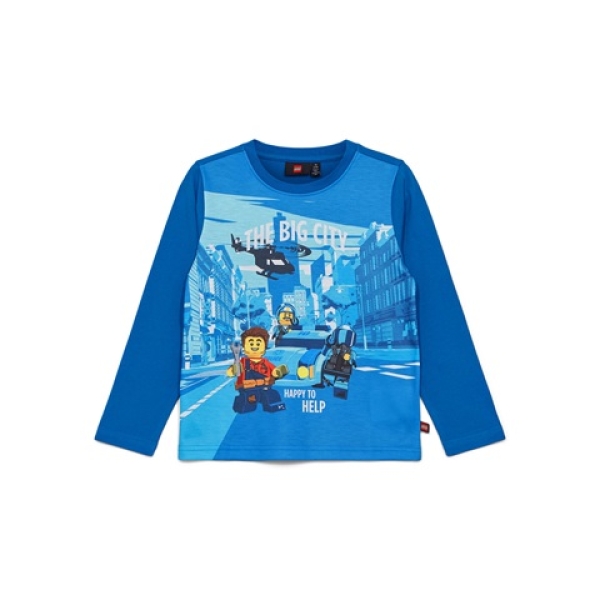 Stoer blauw T-shirt met lange mouwen in LEGO City thema heeft een gigantische print op de voorkant en de tekst The Big City Happy to Help. In de halsopening van het T-shirt zit een kleine ribboord voor extra comfort. De bedrukte voorkant is gemaakt van polyester, terwijl de rest van het T-shirt is gemaakt van biologisch katoen.