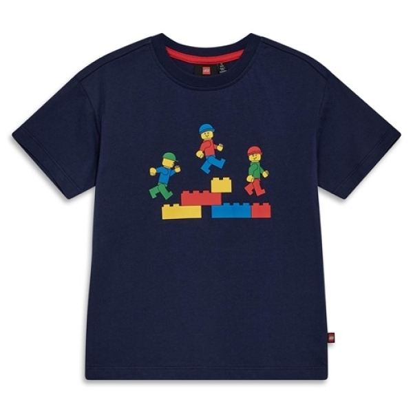 De voorkant van het T-shirt heeft een levendige print van LEGO-minifiguren die over kleurrijke LEGO-stenen springen, wat elke outfit een leuke en fantasierijke touch geeft.
