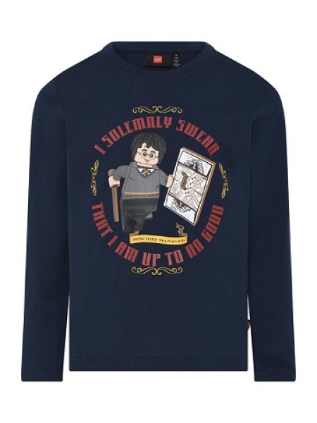 Leuk donkerblauw LEGO T-shirt van Harry Potter met lange mouwen. Op de voorzijde staat een opdruk van Harry met de Sluipwegwijzer. De achterzijde is effen.