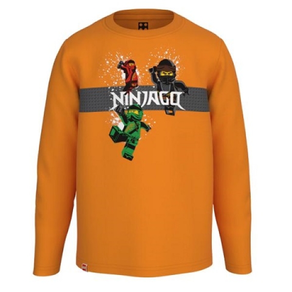 Stoer oranje LEGO Ninjago T-shirt met lange mouwen. Op de voorzijde staat een opdruk van de LEGO Ninjago ninja’s Kai, Cole en Lloyd. De achterzijde is effen.