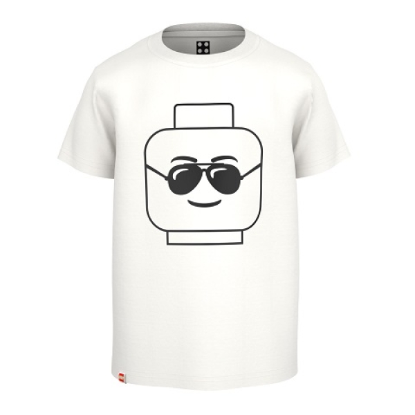 Stoer wit LEGO T-shirt met korte mouwen. Op de voorkant staat een print van een stoer LEGO minifiguur hoofdje. De achterzijde is effen.