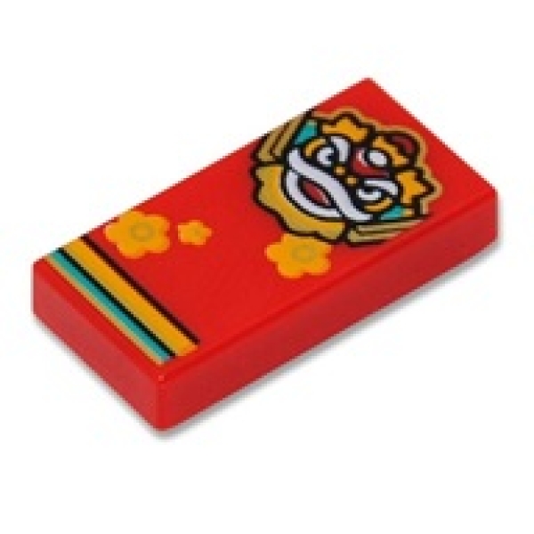 LEGO Tegel 1×2 met opdruk van een Leeuwen- / Niankop, bloemen en strepen.