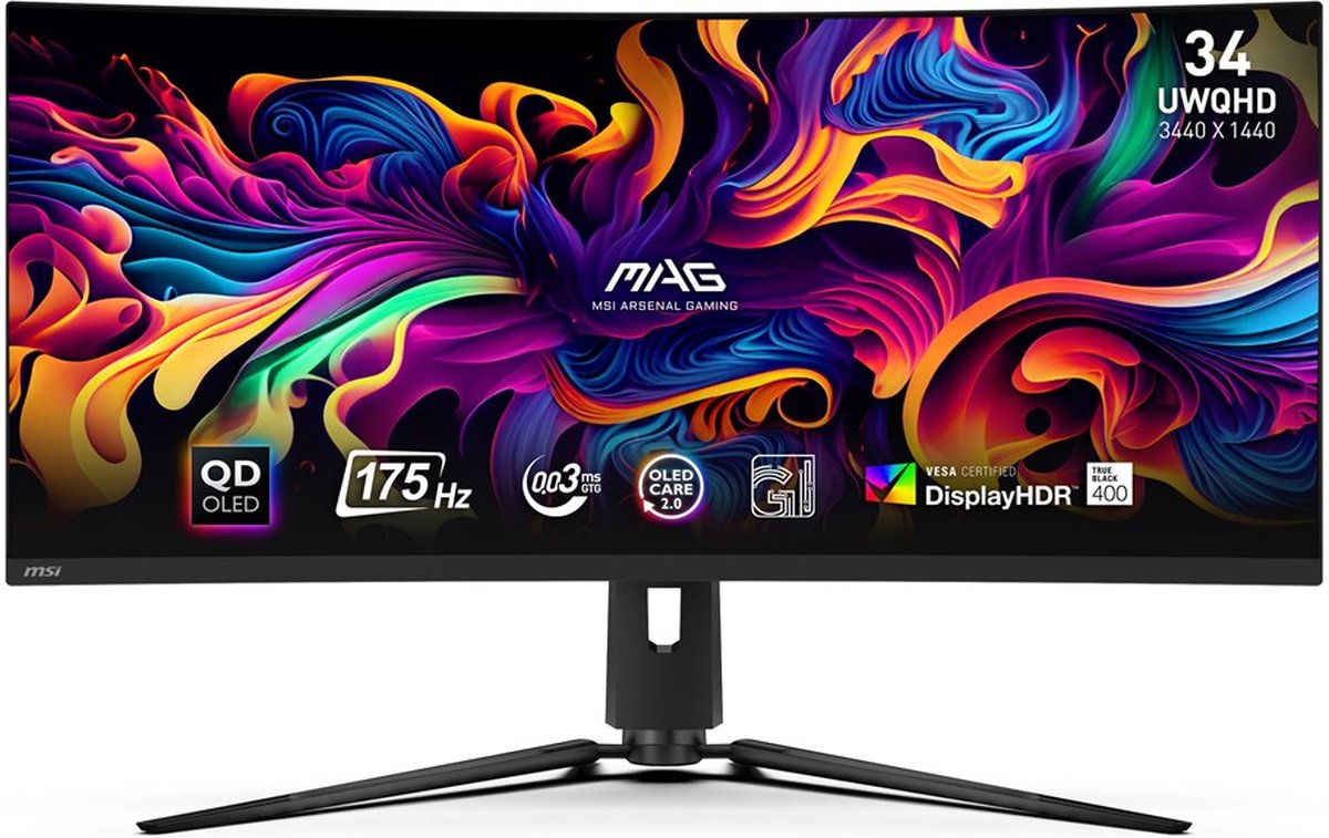 - Paneel: 34″ Curved QD-OLED (3440×1440, 21:9) – perfect voor races, simulaties en cinematografische games